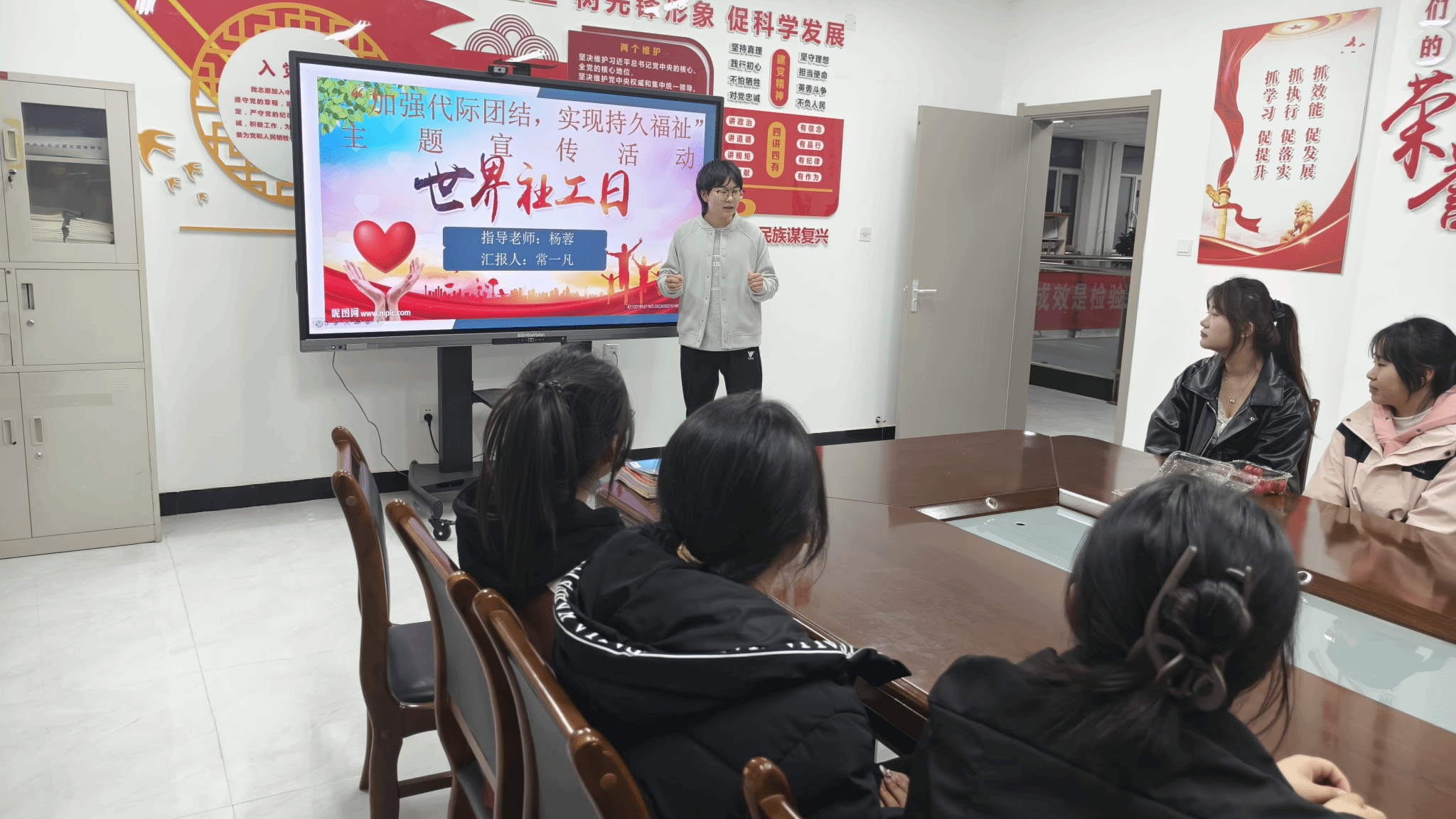 2025年3月18日,天游线路测速登录中心为庆祝第19个世界社工日,弘扬社会工作精神,增强学生社会责任感和使命感,紧紧围绕 “加强代际团结,实现持久福祉”主题举办了世界社工日主题活动。世界社工日定于每年三月的第三个星期二,旨在弘扬社会工作精神,推动社会工作发展,促进社会和谐进步。主题活动由杨蓉老师主持,社会工作专业师生20余人参加。