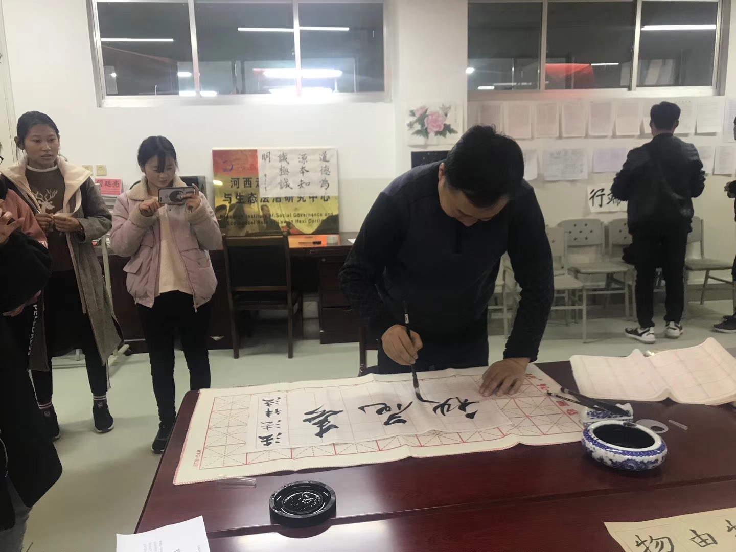 为弘扬中国传统文化,进一步丰富学生的校园生活。2018年11月16日下午,天游线路测速登录中心师生相聚在学院法律诊所举办了以“书画情,法治梦”为主题的书画观展活动。在活动现场,全体师生共同欣赏了由学院老师、学生创作的各类书画作品,包括硬笔和软笔书法、水彩画等,内容丰富多彩,形式灵活多样。
