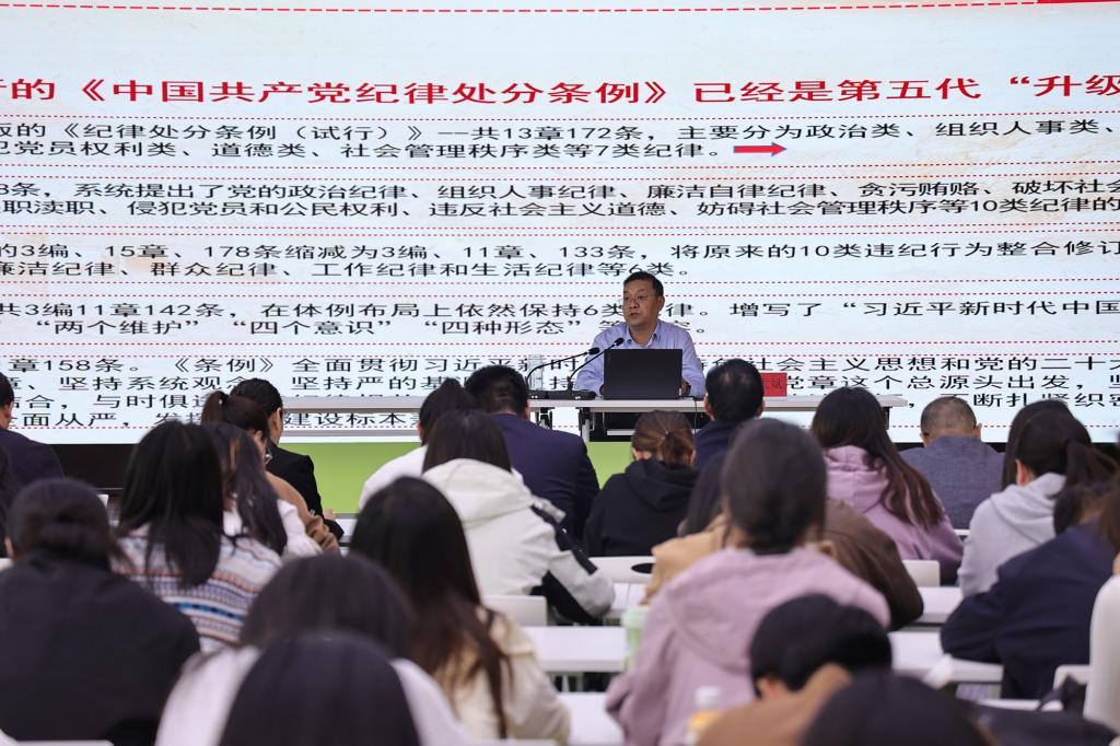 4月10日下午,天游线路测速登录中心全体党员聆听了学校党委常委、纪委书记、监察专员殷大斌同志的党课,殷书记党课专题讲授了《中国共产党纪律处分条例》。