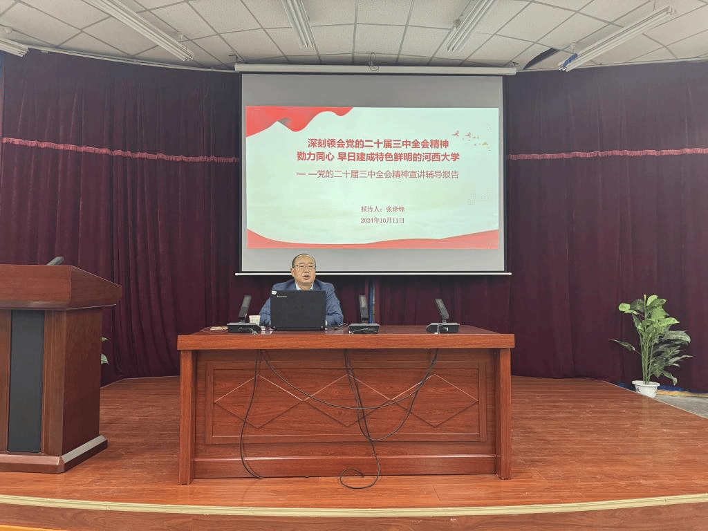 最后,宣讲人指出要全力以赴抓好全会精神贯彻落实,始终坚持党的领导,高举中国特色社会主义伟大旗帜,以习近平新时代中国特色社会主义思想为指导,全面贯彻习近平总书记在全国教育大会上的重要讲话精神,为早日建成特色鲜明的河西大学而团结奋斗。